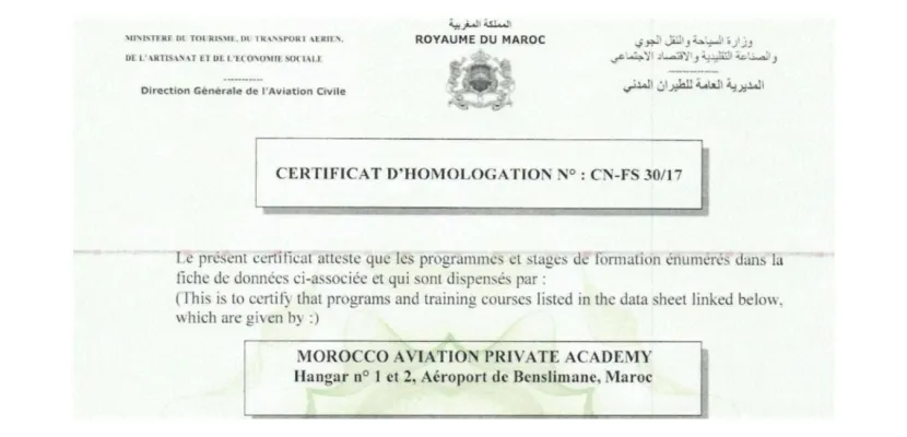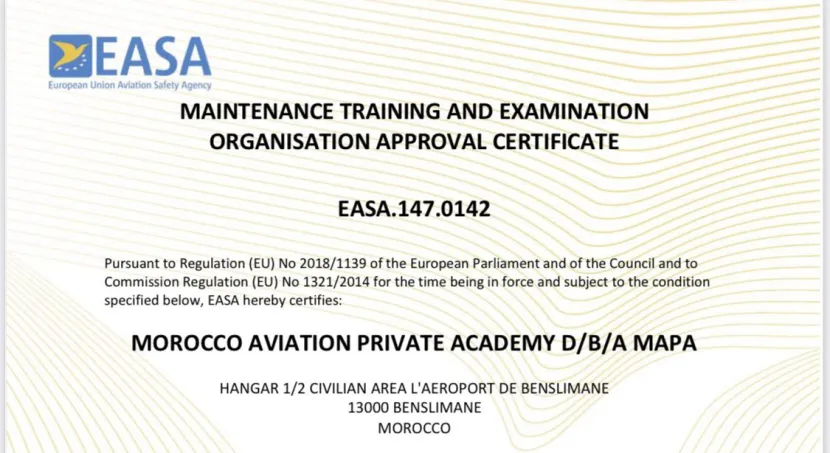 Morocco Aviation Private Academy (MAPA), détentrice de l’agrément PART 147 depuis 2018 et l'agrément étatique depuis 2022, offre une formation complète permettant d'acquérir à la fois la licence EASA Part 66 et la licence marocaine en maintenance aéronautique. Les étudiants s'engagent dans un programme intensif qui se déroule au centre de formations de Benslimane, où ils sont préparés aux modules théoriques et pratiques nécessaires pour les licences B1.1 & B2. ainsi que TMA B1.2 & TMA A2